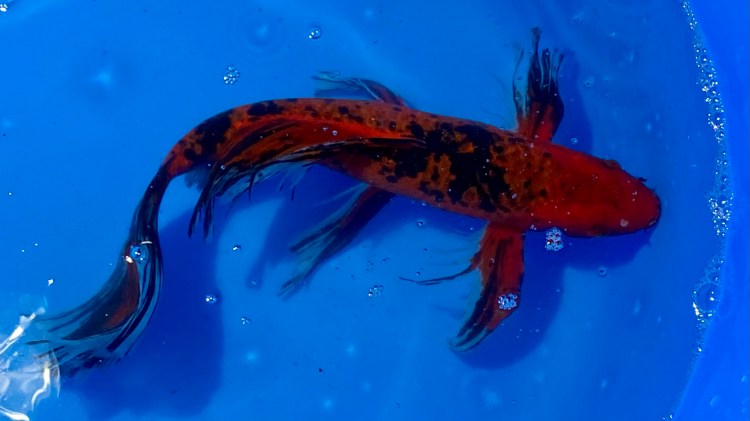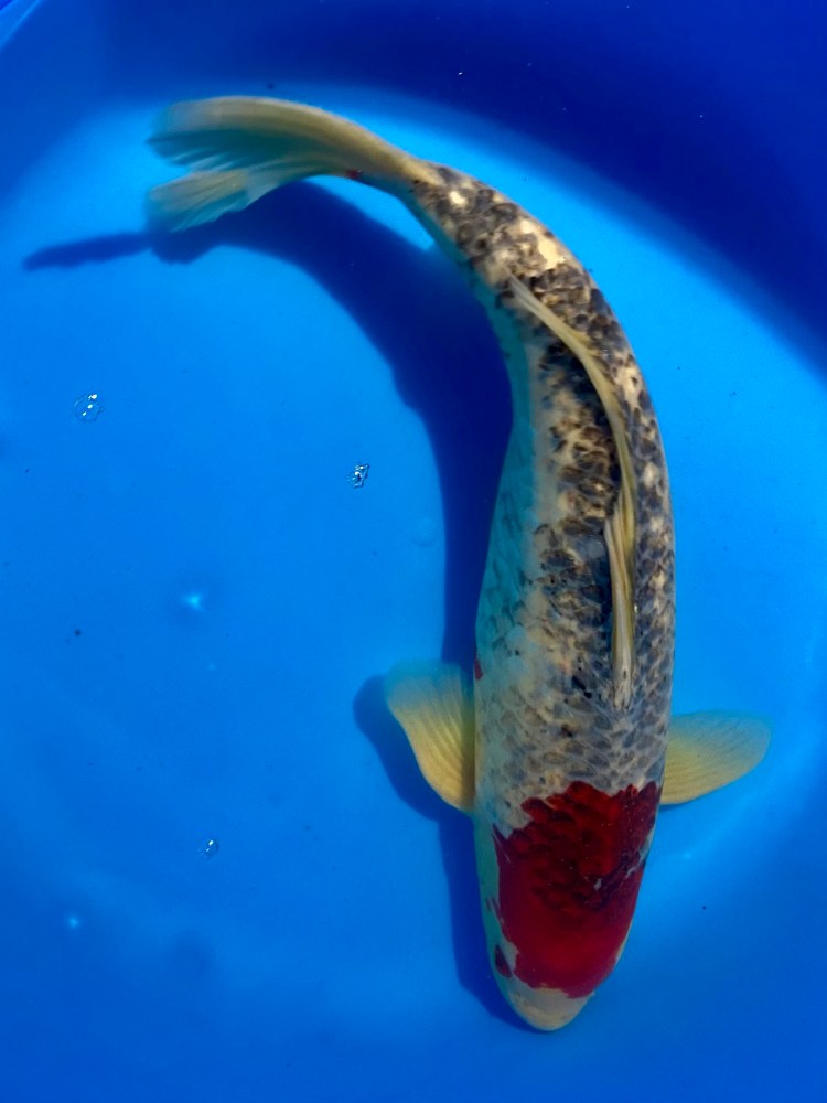 Showa koi have a thick, sumi-dominant base color with a shiny appearance. The black extends along the length of the body and sparsely extends into the fins.